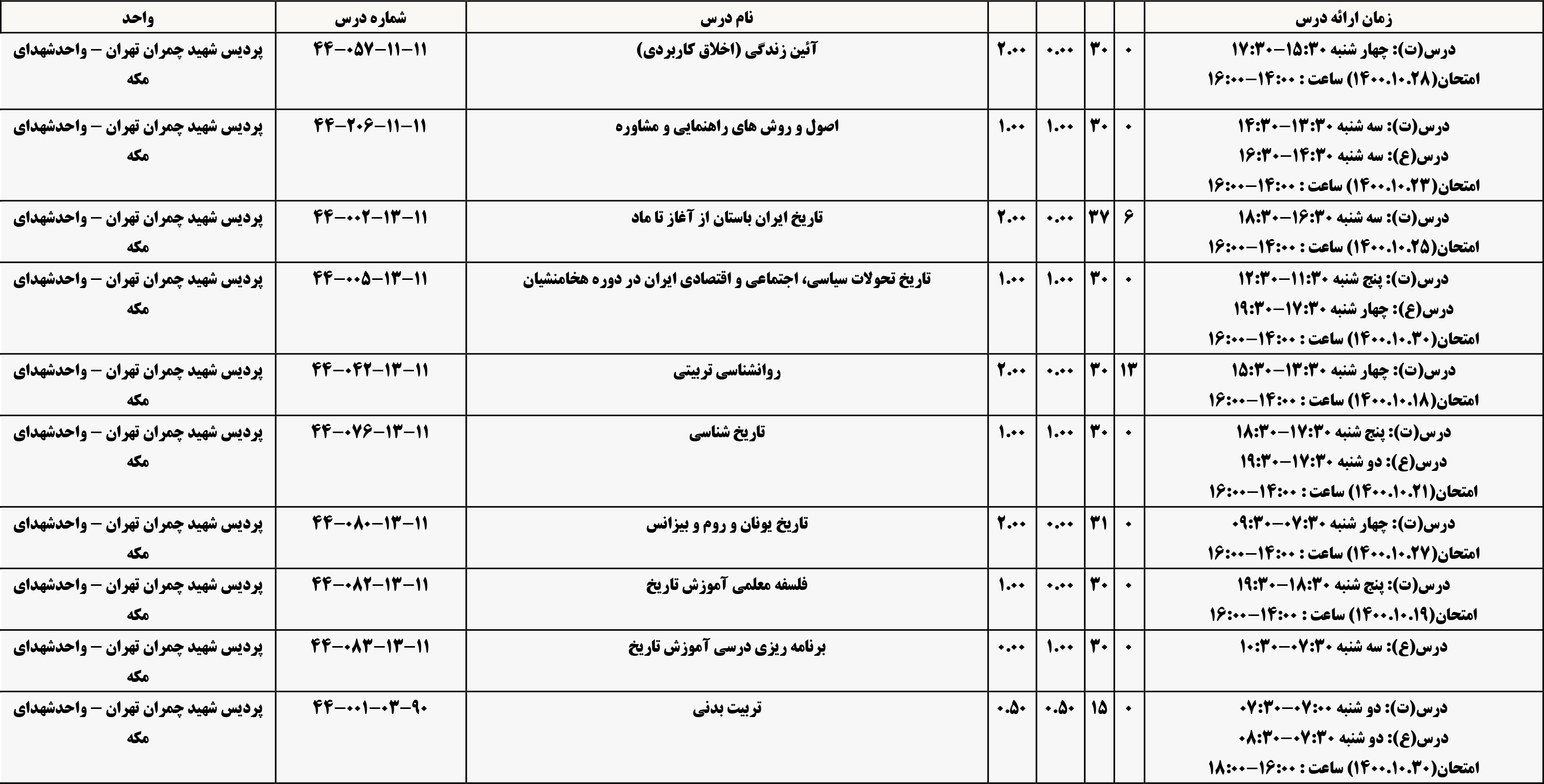 برنامه هفتگی رشته آموزش تاریخ ورودی مهر 1400