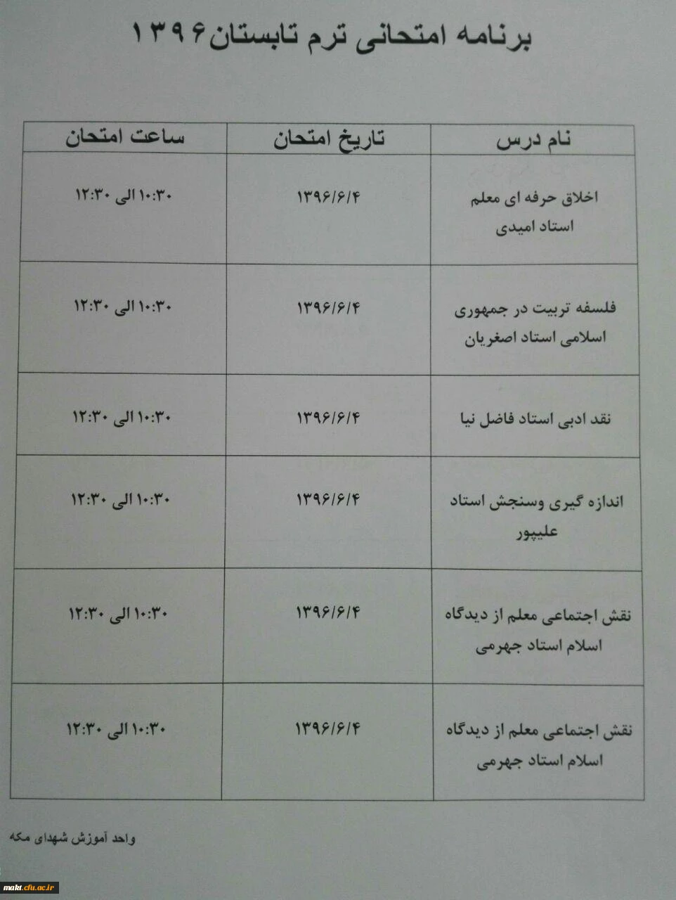 امتیاز دهید : برنامه امتحانی نیمسال تابستان دانشجومعلمان مرکز شهدای مکه 2 چهارشنبه 1 شهریور 1396 ساعت 12:36
