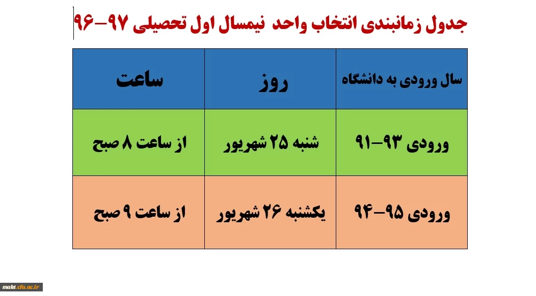 امتیاز دهید : اطلاعیه: جدول زمانبندی انتخاب واحد نیمسال اول تحصیلی 97-96 2 شنبه 25 شهریور 1396 ساعت 13:52