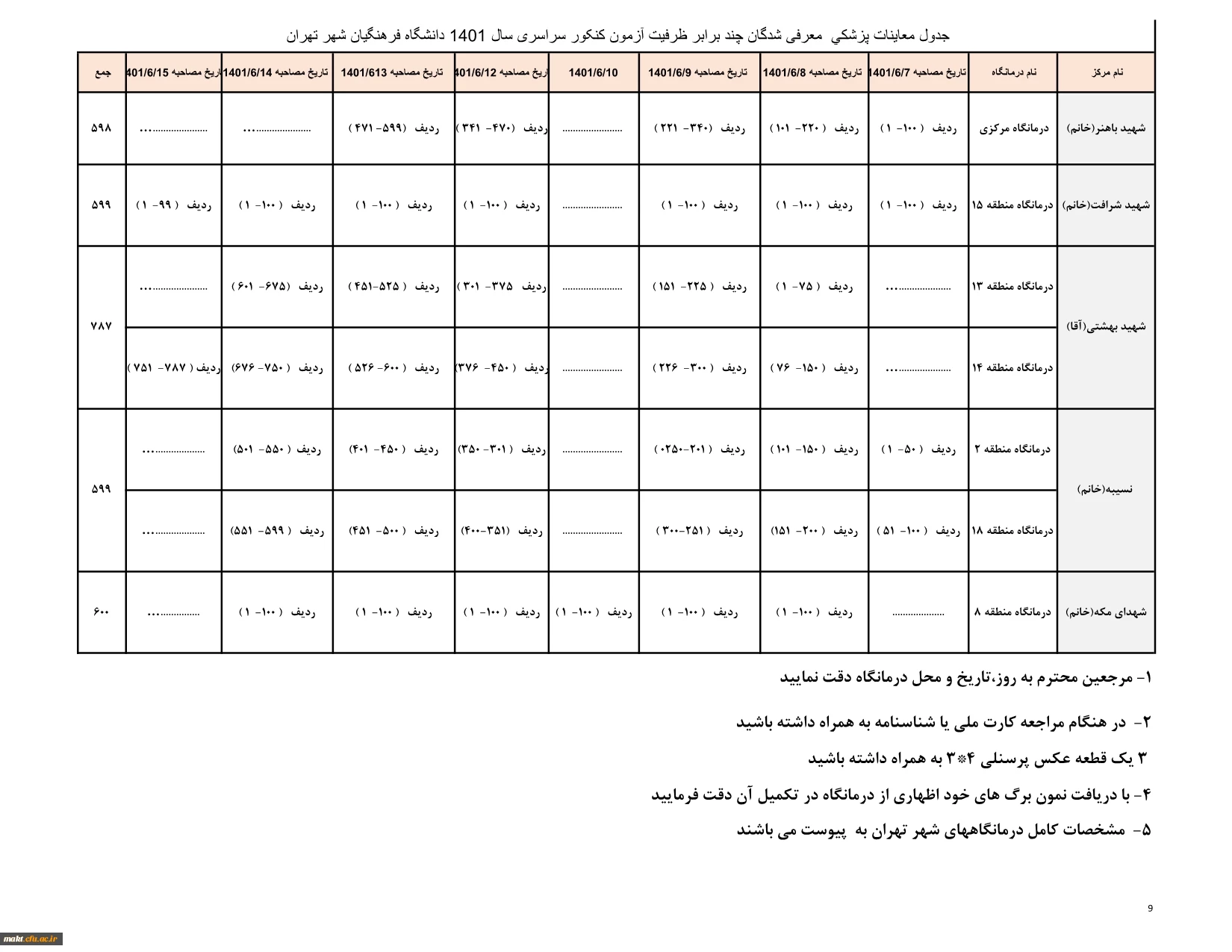 جدول معاینات پزشکی معرفی شدگان چند برابر ظرفیت آزمون کنکور سراسری سال 1401 دانشگاه فرهنگیان شهر تهران 2